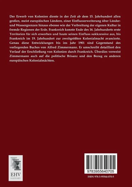 Der Erwerb von Kolonien diente in der Zeit ab dem 15. Jahrhundert allen großen, meist europäischen Ländern, einer Einflusserweiterung über Länder- und Wassergrenzen hinaus ebenso wie der Verbreitung der eigenen Kultur in fremde Regionen der Erde. Frankreich konnte Ende des 16. Jahrhunderts erste Territorien für sich erwerben und baute seinen Einfluss sukkzessive aus, bis Frankreich im 19. Jahrhundert zur zweitgrößten Kolonialmacht avancierte. Genau diese Entwicklungen bis ins Jahr 1901 sind Gegenstand des vorliegenden Buches von Alfred Zimmermann. Er umschreibt detailliert den Verlauf der Erschließung von Kolonien durch Frankreich. Überdies verweist Zimmermann auch auf die politische Brisanz und den Bezug zu anderen europäischen Kolonialmächten.
