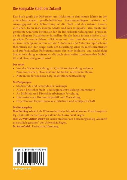 Das Buch greift die Diskussion um Inklusion in den letzten Jahren in den unterschiedlichsten gesellschaftlichen Zusammenhängen kritisch auf. Ausgangspunkt der Betrachtung ist die Stadt und das urbane Zusammenleben. Denn insbesondere Städte und hier kompakte, also dichte und gemischte Quartiere bieten sich für die Inklusionsforschung und -praxis an, da sie adäquate Sozialräume darstellen, die das heute immer stärker urban geprägte Zusammenleben reflektieren und neu durchbuchstabieren. Vor diesem Hintergrund setzen sich die Autorinnen und Autoren empirisch und theoretisch mit der Frage nach der Gestaltung eines zukunftsorientierten und professionellen Referenzrahmens für eine inklusive und nachhaltige Stadtentwicklung auseinander, die auch einer weiter zunehmenden Mobilität und Diversität gerecht wird.