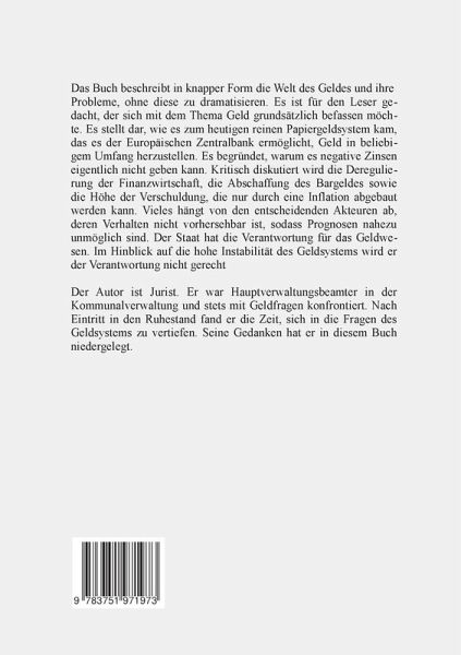 Das Buch beschreibt die Probleme des Geldsystem ohne zu dramatisieren. Es erklärt, wie es zu dem heutigen reinen Papiergeldsystem kam, das es der Europäischen Zentralbank ermöglicht, Geld in unbegrenztem Umfang herzustellen. Es begründet, warum es negative Zinsen eigentlich nicht geben kann. Kritisch diskutiert wird die Deregulierung der Finanzwirtschaft, die Abschaffung des Bargeldes und die Höhe der Verschuldung, die nur noch durch Inflation abgebaut werden kann. Der Staat wird seiner Verantwortung für das Geldsystem nicht gerecht.