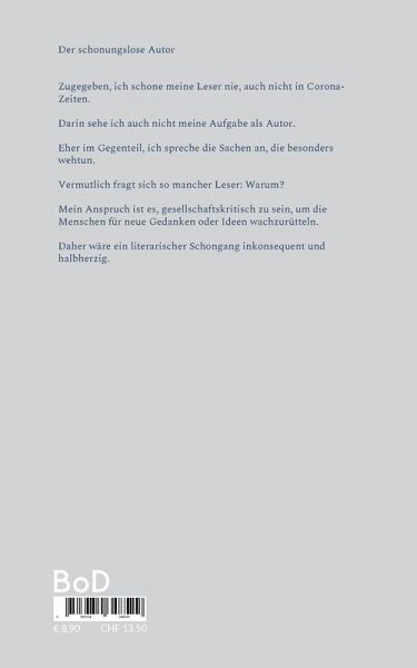 Der schonungslose Autor Zugegeben, ich schone meine Leser nie, auch nicht in Corona-Zeiten.Darin sehe ich auch nicht meine Aufgabe als Autor. Eher im Gegenteil, ich spreche die Sachen an, die besonders wehtun. Vermutlich fragt sich so mancher Leser: Warum? Mein Anspruch ist es, gesellschaftskritisch zu sein, um die Menschen für neue Gedanken oder Ideen wachzurütteln. Daher wäre ein literarischer Schongang inkonsequent und halbherzig.