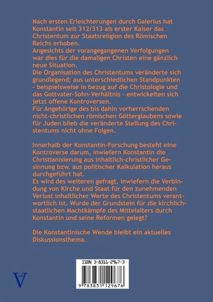 Zusammenfassend werden die sachlichen Hintergründe der erstmaligen Hervorhebung des Christentums zur Staatsreligion des Römischen Reichs durch Kaiser Konstantin (312/313) dargestellt.