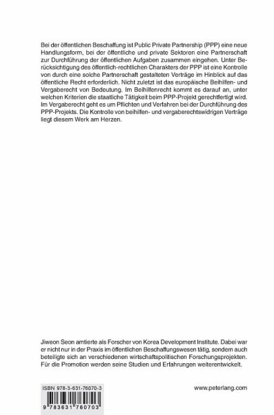 Bei der öffentlichen Beschaffung ist Public Private Partnership (PPP) eine neue Handlungsform, bei der öffentliche und private Sektoren eine Partnerschaft zur Durchführung der öffentlichen Aufgaben zusammen eingehen. Unter Berücksichtigung des öffentlich-rechtlichen Charakters der PPP ist eine Kontrolle von durch eine solche Partnerschaft gestalteten Verträge im Hinblick auf das öffentliche Recht erforderlich. Nicht zuletzt ist das europäische Beihilfen- und Vergaberecht von Bedeutung. Im Beihilfenrecht kommt es darauf an, unter welchen Kriterien die staatliche Tätigkeit beim PPP-Projekt gerechtfertigt wird. Im Vergaberecht geht es um Pflichten und Verfahren bei der Durchführung des PPP-Projekts. Die Kontrolle von beihilfen- und vergaberechtswidrigen Verträge liegt diesem Werk am Herzen.