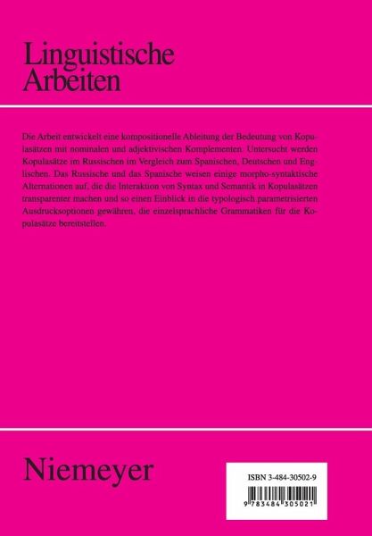 Untersucht werden Kopulasätze im Russischen im Vergleich zum Spanischen, Deutschen und Englischen. Die enge Interaktion zwischen Morpho-Syntax und Semantik zeigt sich im Spanischen an den beiden Kopulaverben ser und estar und im Russischen an Spezifika wie Kasusalternation beim nominalen und adjektivischen Prädikativ, distinkter Kongruenzmarkierung beim prädikativen Adjektiv u.v.a. Die detaillierte Analyse dieser Konstruktionen gewährt einen Einblick in die typologisch parametrisierten Ausdrucksoptionen, die einzelsprachliche Grammatiken für die Kopulasätze bereitstellen. Die Untersuchung liefert Aufschluss darüber, wie Satzbildung unter Minimalbedingungen funktioniert, und leistet damit einen wichtigen Beitrag zur Diskussion über die Kompositionalität in der Satzsemantik.