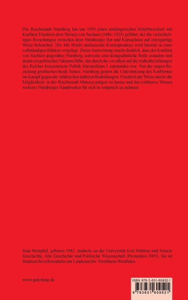 Die Reichsstadt Nürnberg hat um 1500 einen umfangreichen Schriftwechsel mit Kurfürst Friedrich dem Weisen von Sachsen (1486 -1525) geführt, der die vielschichtigen Beziehungen zwischen dem Nürnberger Rat und Kursachsen auf einzigartige Weise beleuchtet. Die 446 Briefe umfassende Korrespondenz wird hiermit in einer vollständigen Edition vorgelegt. Deren Auswertung macht deutlich, dass der Kurfürst von Sachsen gegenüber Nürnberg zeitweise eine königsähnliche Rolle einnahm und damit ein politisches Vakuum füllte, das durch die vor allem auf die Außenbeziehungen des Reiches konzentrierte Politik Maximilians I. entstanden war. Von der engen Beziehung profitierten beide Seiten: Nürnberg genoss die Unterstützung des Kurfürsten im Kampf gegen die zahlreichen äußeren Bedrohungen. Friedrich der Weise nutzte die Möglichkeit, in der Reichsstadt Münzen prägen zu lassen und das exklusive Wissen weiterer Nürnberger Handwerker für sich in Anspruch zu nehmen.