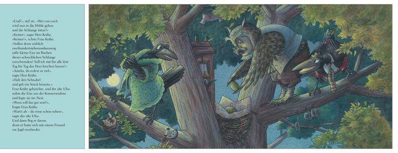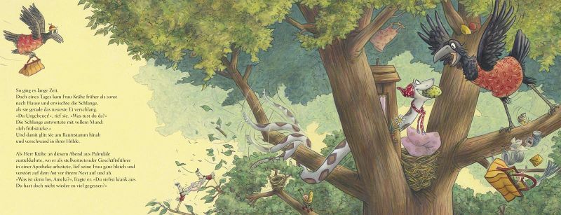 Jeden Tag legt Frau Krähe ein Ei. Und jeden Tag, wenn Frau Krähe zum Einkaufen geht, schlängelt sich eine gierige Klapperschlange den Baumstamm hinauf bis zum Krähennest und verspeist das frisch gelegte Ei. Was soll Frau Krähe nur tun? Zum Glück hat der schlaue Uhu eine fabelhafte Idee. Zusammen mit Herrn Krähe formt er Eier aus Lehm und legt sie stattdessen ins Krähennest. Auch die werden gierig von der bösen Schlange verschlungen. Das bekommt ihr natürlich überhaupt nicht, sie windet und wendet sich vor Bauchschmerzen, verknotet sich in den Ästen des Baumes und endet schließlich als Wäscheleine.