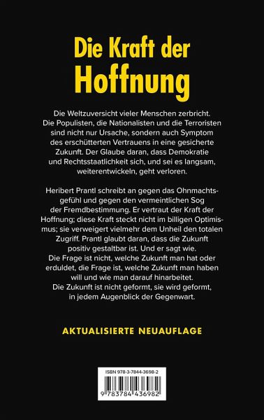 Die Weltzuversicht vieler Menschen zerbricht. Die Populisten, die Nationalisten und die Terroristen sind nicht nur Ursache, sondern auch Symptom des erschütterten Vertrauens in eine gesicherte Zukunft. Der Glaube daran, dass Demokratie und Rechtstaatlichkeit sich, und sei es langsam, weiterentwickeln, geht verloren. Heribert Prantl schreibt an gegen das Ohnmachtsgefühl und gegen den vermeintlichen Sog der Fremdbestimmung. Er vertraut der Kraft der Hoffnung; diese Kraft steckt nicht im billigen Optimismus; sie verweigert vielmehr dem Unheil den totalen Zugriff. Prantl glaubt daran, dass die Zukunft positiv gestaltbar ist. Und er sagt wie. Die Frage ist nicht, welche Zukunft man hat oder erduldet, die Frage ist, welche Zukunft man haben will und wie man darauf hinarbeitet. Die Zukunft ist nicht geformt, sie wird geformt, in jedem Augenblick der Gegenwart.