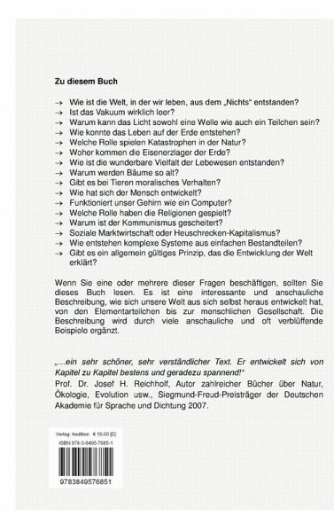 Es gibt ein naturwissenschaftliches Prinzip, das die Entwicklung der Welt vom Urknall bis hin zum Geist und zu den menschlichen Sozialordnungen durchgängig erklärt: Die Emergenz. Sie verbindet die materielle Welt mit der Welt des Geistes. Die Emergenz basiert auf der spontanen Selbstorganisation einfacher Elemente zu komplexen Systemen, die völlig neue Strukturen aufweisen, und deren kollektive Eigenschaften und Fähigkeiten ganz anders sind als die der Elemente. Die Strukturen, Eigenschaften und Fähigkeiten der Systeme lassen sich aus denen der Elemente in der Regel nicht berechnen. Die Emergenz ist in der Natur der Normalfall und nicht die Ausnahme, von den Elementarteilchen durch alle Ebenen der Welt bis hinauf in die Ebene des Geistes und der menschlichen Gesellschaft. Unsere Welt hat sich Schritt für Schritt aus emergenten Systemen entwickelt, vom Urknall bis in die Gegenwart, und entwickelt sich ständig weiter. Das Buch behandelt am Anfang die Konzepte und Begriffe der Emergenz. Anschließend ist die erste Hälfte dem Wirken der Emergenz in der unbelebten Natur gewidmet, von den fundamentalen Teilchen und Kräften, den Atomen und ihrem Aufbau, den Festkörpern, den kollektiven Quanteneffekten und den chaotischen Prozessen bis hin zu den Molekülen. Ein kleiner Ausflug in die selbstorganisierten Vorgänge des Weltalls darf natürlich nicht fehlen. In der zweite Hälfte wird das Wirken der Selbstorganisation in der Welt der Lebewesen beschrieben, von der Entstehung und Entwicklung des Lebens über Viren, Bakterien, Pflanzen und Tiere bis zum Menschen, seinem Geist und der menschlichen Gesellschaft. Diese Entwicklung hat nachweislich nicht auf der Basis des blinden Zufalls von Mutationen und der Selektion beim Kampf ums Dasein stattgefunden. Sie ist sehr viel stärker durch kooperative Prozesse der Selbstorganisation wie Symbiosen, Ko-Evolutionen und soziale Kooperationen bestimmt worden. Die Kraft der Selbstorganisation und der Erfolg der emergenten Systeme kommt aus der großen Anzahl und Vielfalt der Elemente, die symbiotisch zusammenwirken. Es ist höchste Zeit, diese Erkenntnis zum Allgemeingut zu machen und die ethischen und moralischen Regeln der menschlichen Gesellschaft danach neu auszurichten.