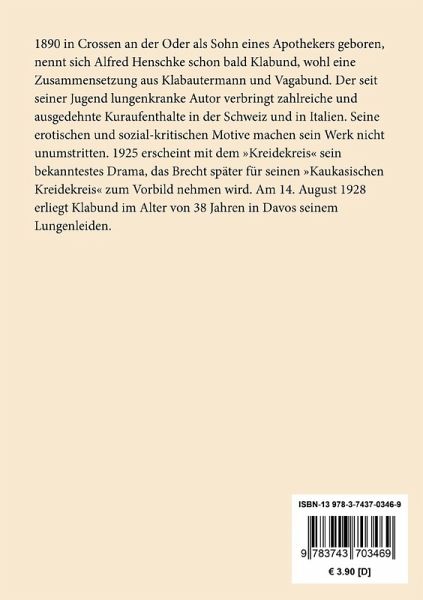1890 in Crossen an der Oder als Sohn eines Apothekers geboren, nennt sich Alfred Henschke schon bald Klabund, wohl eine Zusammensetzung aus Klabautermann und Vagabund. Der seit seiner Jugend lungenkranke Autor verbringt zahlreiche und ausgedehnte Kuraufenthalte in der Schweiz und in Italien. Seine erotischen und sozial-kritischen Motive machen sein Werk nicht unumstritten. 1925 erscheint mit dem "Kreidekreis" sein bekanntestes Drama, das Brecht später für seinen "Kaukasischen Kreidekreis" zum Vorbild nehmen wird. Am 14. August 1928 erliegt Klabund im Alter von 38 Jahren in Davos seinem Lungenleiden.