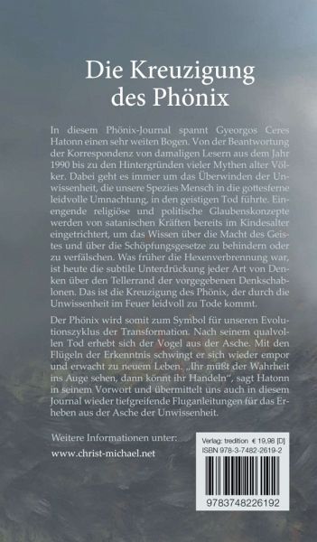 In diesem Phönix-Journal spannt Gyeorgos Ceres Hatonn einen sehr weiten Bogen. Von der Beantwortung der Korrespondenz von damaligen Lesern aus dem Jahr 1990 bis zu den Hintergründen vieler Mythen alter Völker. Dabei geht es immer um das Überwinden der Unwissenheit, die unsere Spezies Mensch in die gottesferne leidvolle Umnachtung, in den geistigen Tod führte. Einengende religiöse und politische Glaubenskonzepte werden von satanischen Kräften bereits im Kindesalter eingetrichtert, um das Wissen über die Macht des Geistes und über die Schöpfungsgesetze zu behindern oder zu verfälschen. Was früher die Hexenverbrennung war, ist heute die subtile Unterdrückung jeder Art von Denken über den Tellerrand der vorgegebenen Denkschablonen. Das ist die Kreuzigung des Phönix, der durch die Unwissenheit im Feuer leidvoll zu Tode kommt. Der Phönix wird somit zum Symbol für unseren Evolutionszyklus der Transformation. Nach seinem qualvollen Tod erhebt sich der Vogel aus der Asche. Mit den Flügelnder Erkenntnis schwingt er sich wieder empor und erwacht zu neuem Leben. "Ihr müßt der Wahrheit ins Auge sehen, dann könnt ihr Handeln", sagt Hatonn in seinem Vorwort und übermittelt uns auch in diesem Journal wieder tiefgreifende Fluganleitungen für das Erheben aus der Asche der Unwissenheit.