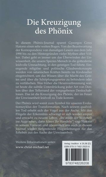 In diesem Phönix-Journal spannt Gyeorgos Ceres Hatonn einen sehr weiten Bogen. Von der Beantwortung der Korrespondenz von damaligen Lesern aus dem Jahr 1990 bis zu den Hintergründen vieler Mythen alter Völker. Dabei geht es immer um das Überwinden der Unwissenheit, die unsere Spezies Mensch in die gottesferne leidvolle Umnachtung, in den geistigen Tod führte. Einengende religiöse und politische Glaubenskonzepte werden von satanischen Kräften bereits im Kindesalter eingetrichtert, um das Wissen über die Macht des Geistes und über die Schöpfungsgesetze zu behindern oder zu verfälschen. Was früher die Hexenverbrennung war, ist heute die subtile Unterdrückung jeder Art von Denken über den Tellerrand der vorgegebenen Denkschablonen. Das ist die Kreuzigung des Phönix, der durch die Unwissenheit im Feuer leidvoll zu Tode kommt. Der Phönix wird somit zum Symbol für unseren Evolutionszyklus der Transformation. Nach seinem qualvollen Tod erhebt sich der Vogel aus der Asche. Mit den Flügelnder Erkenntnis schwingt er sich wieder empor und erwacht zu neuem Leben. "Ihr müßt der Wahrheit ins Auge sehen, dann könnt ihr Handeln", sagt Hatonn in seinem Vorwort und übermittelt uns auch in diesem Journal wieder tiefgreifende Fluganleitungen für das Erheben aus der Asche der Unwissenheit.
