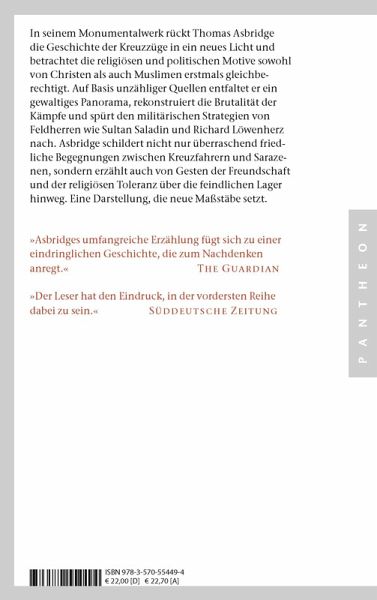 In seinem Monumentalwerk rückt Thomas Asbridge die Geschichte der Kreuzzüge zwischen dem 11. und 13. Jahrhundert in ein neues Licht: Denn im Gegensatz zur gängigen Vorstellung war dies keineswegs ein unvermeidlicher Kampf des Westens gegen den Orient. So erzählt der britische Historiker erstmals gleichberechtigt von den von Christen und Muslimen verübten Grausamkeiten und erduldeten Leiden. Auf Basis einer Vielzahl von Quellen entfaltet der Mittelalterexperte ein gewaltiges Panorama, das sowohl die politischen als auch die religiösen Motive aller Seiten beleuchtet. Dabei rekonstruiert er die Brutalität der Kämpfe und spürt den militärischen Strategien von Feldherren wie Sultan Saladin und Richard Löwenherz nach. Asbridge schildert nicht nur überraschend friedliche Begegnungen zwischen Kreuzfahrern und Sarazenen, sondern erzählt auch von Gesten der Freundschaft und der religiösen Toleranz über die feindlichen Lager hinweg. Eine Darstellung, die neue Maßstäbe setzt.