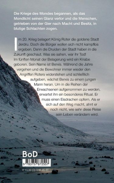 Die Kriege des Mondes begannen, als das Mondlicht seinen Glanz verlor und die Menschen, getrieben von der Gier nach Macht und Besitz, in blutige Schlachten zogen.Im 20. Krieg belagert König Roter die goldene Stadt Jerdru. Doch die Bürger wollen sich nicht kampflos ergeben. Denn die Druiden der Stadt haben in die Zukunft geschaut. Was sie sahen, war ihr Tod!Im fünften Monat der Belagerung wird ein Knabe geboren. Sein Name ist Berxis. Während die Jahre vergehen und die Bewohner immer wieder den Angriffen Roters widerstehen und schließlich aufgeben, wächst Berxis zu einem jungen Mann heran. Um in die Reihen der Erwachsenen aufgenommen zu werden, erwartet ihn ein besonderes Ritual. Er muss einen Eisdrachen opfern. Als er sich auf den Weg macht, ahnt er noch nicht, wie sehr diese Reise sein Leben verändern wird.