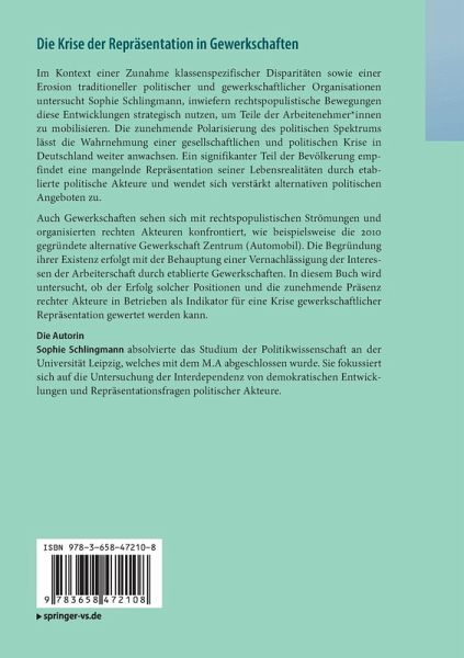 Auch Gewerkschaften sehen sich mit rechtspopulistischen Strömungen und organisierten rechten Akteuren konfrontiert, wie beispielsweise die 2010 gegründete alternative Gewerkschaft Zentrum (Automobil). Die Begründung ihrer Existenz erfolgt mit der Behauptung einer Vernachlässigung der Interessen der Arbeiterschaft durch etablierte Gewerkschaften. In diesem Buch wird untersucht, ob der Erfolg solcher Positionen und die zunehmende Präsenz rechter Akteure in Betrieben als Indikator für eine Krise gewerkschaftlicher Repräsentation gewertet werden kann.