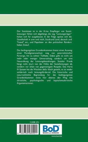 Der Sozialstaat ist in der Krise. Empfänger von Sozial-leistungen fühlen sich abgehängt, die sog. "Leistungsträger" halten sich für ausgebeutet. In der Folge spaltet sich die Gesellschaft in arm und reich, Stadt und Land, deutsch und "fremd" etc., und Populisten an den politischen Rändern haben Zulauf. Das bedingungslose Grundeinkommen bietet einen Ausweg: einen Paradigmenwechsel, weg von paternalistischer Fürsorge, hin zu echter Teilhabe. Dabei geht es nicht um mehr oder weniger Umverteilung, sondern um eine Neuordnung der Leistungsbeziehungen. Sozialer Friede hängt nicht (nur) von der Höhe der Sozialleistungen ab, sondern vor allem von gegenseitigem Respekt. Das Hartz IV-System hat die Weichen dafür falsch gestellt, es ist weder solidarisch noch leistungsfördernd. Die historische und naturrechtliche Begründung für das Grundeinkommen weist hier ebenso den Weg wie christliche, psychologische und kapitalismuskritische Argumentationen.