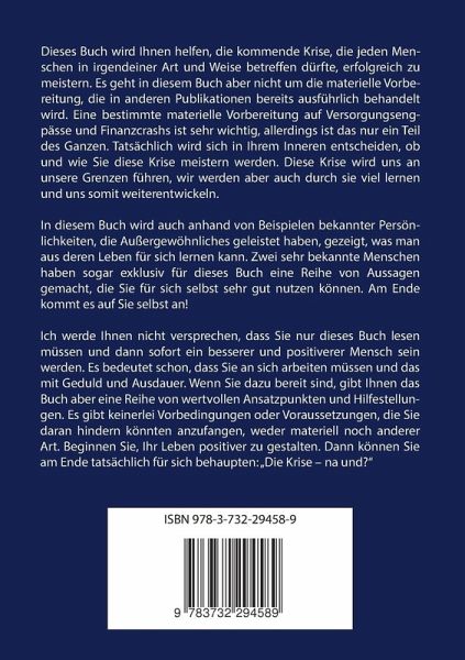 Dieses Buch wird Ihnen helfen, die kommende Krise, die jeden Menschen in irgendeiner Art und Weise betreffen dürfte, erfolgreich zu meistern. Es geht in diesem Buch aber nicht um die materielle Vorbereitung, die in anderen Publikationen bereits ausführlich behandelt wird. Eine bestimmte materielle Vorbereitung auf Versorgungsengpässe und Finanzcrashs ist sehr wichtig, allerdings ist das nur ein Teil des Ganzen. Tatsächlich wird sich in Ihrem Inneren entscheiden, ob und wie Sie diese Krise meistern werden. Diese Krise wird uns an unsere Grenzen führen, wir werden aber auch durch sie viel lernen und uns somit weiterentwickeln.Wenn Sie schon heute nichts mehr aus der Bahn werfen kann, wenn Sie nur noch positiv durchs Leben gehen, egal was passiert, sich praktisch nie ärgern oder in eine traurige Stimmung verfallen, wenn Sie im Jetzt leben und sich weder in der Vergangenheit noch in der Zukunft gedanklich aufhalten, dann benötigen Sie dieses Buch nicht mehr. Wichtig ist es aber, dasshierbei keine Verdrängung im Spiel ist, denn die wird Sie immer wieder einholen. Ansonsten finden Sie in diesem Buch Vorschläge, Ideen und auch sehr praktische Übungen, wie Sie positiver werden können. Das wird Ihnen nicht nur in der Krise helfen und dort vielleicht sogar überlebenswichtig sein, sondern auch Ihre Lebensqualität steigern. Kleinere und größere individuelle Krisen gibt es bei fast jedem Menschen immer wieder einmal.In diesem Buch wird außerdem anhand von Beispielen bekannter Persönlichkeiten, die Außergewöhnliches geleistet haben, gezeigt, was man aus deren Leben für sich lernen kann. Zwei sehr bekannte Menschen haben sogar exklusiv für dieses Buch eine Reihe von Aussagen gemacht, die Sie für sich selbst sehr gut nutzen können. Am Ende kommt es auf Sie selbst an!Ich werde Ihnen nicht versprechen, dass Sie nur dieses Buch lesen müssen und dann sofort ein besserer und positiverer Mensch sein werden. Es bedeutet schon, dass Sie an sich arbeiten müssen und das mit Geduld und Ausdauer. Wenn Sie dazu bereit sind, gibt Ihnen das Buch aber eine Reihe von wertvollen Ansatzpunkten und Hilfestellungen. Es gibt keinerlei Vorbedingungen oder Voraussetzungen, die Sie daran hindern könnten anzufangen, weder materiell noch anderer Art. Beginnen Sie, Ihr Leben positiver zu gestalten. Dann können Sie am Ende tatsächlich für sich behaupten: "Die Krise - na und?"