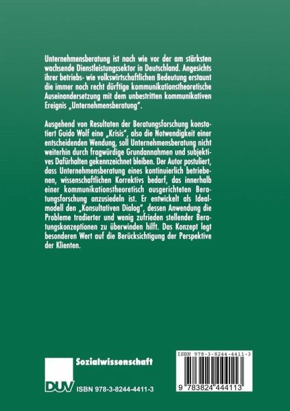 Ausgehend von Resultaten der Beratungsforschung konstatiert Guido Wolf eine "Krisis", also die Notwendigkeit einer entscheidenden Wendung, soll Unternehmensberatung nicht weiterhin durch fragwürdige Grundannahmen und subjektives Dafürhalten gekennzeichnet bleiben. Der Autor postuliert, dass Unternehmensberatung eines kontinuierlich betriebenen, wissenschaftlichen Korrektivs bedarf, das innerhalb einer kommunikationstheoretisch ausgerichteten Beratungsforschung anzusiedeln ist. Er entwickelt als Idealmodell den "Konsultativen Dialog", dessen Anwendung die Probleme tradierter und wenig zufrieden stellender Beratungskonzeptionen zu überwinden hilft. Das Konzept legt besonderen Wert auf die Berücksichtigung der Perspektive der Klienten.