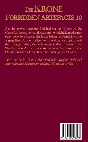 Als ein schwer verletzter Galahad vor den Toren des St. Claire Anwesens bewusstlos zusammenbricht, kann das nur eines bedeuten: Avalon, der letzte bekannte Feenhof, wurde angegriffen. Nur der Träger von Excalibur kann jetzt noch die Königin retten, die sich weigert, den Invasoren den Standort von Artus' Krone mitzuteilen. Auch wenn jede Stunde einer ihrer Untertanen brutal hingerichtet wird.Die Krone ist der zehnte Teil der Forbidden Artefacts-Reihe und kann nicht ohne Kenntnis der anderen Teile gelesen werden.