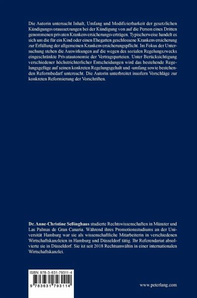 Die Autorin untersucht Inhalt, Umfang und Modifizierbarkeit der gesetzlichen Kündigungsvoraussetzungen bei der Kündigung von auf die Person eines Dritten genommenen privaten Krankenversicherungsverträgen. Typischerweise handelt es sich um die für ein Kind oder einen Ehegatten geschlossene Krankenversicherung zur Erfüllung der allgemeinen Krankenversicherungspflicht. Im Fokus der Untersuchung stehen die Auswirkungen der wegen des sozialen Regelungszwecks eingeschränkten Privatautonomie der Vertragsparteien. Unter Berücksichtigung verschiedener höchstrichterlicher Entscheidungen wird das bestehende Regelungsgefüge auf seinen konkreten Regelungsgehalt und -umfang sowie bestehenden Reformbedarf untersucht. Die Autorin unterbreitet insofern Vorschläge zur konkreten Reformierung der Vorschriften.