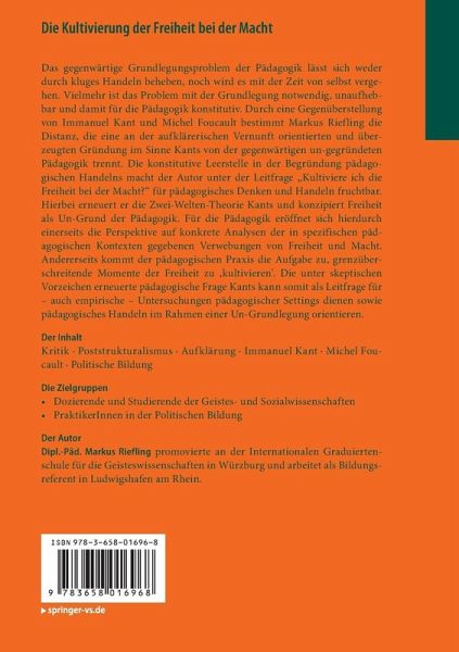 Pädagogisches Handeln ist unter poststrukturalistischer Perspektive nicht mehr letztgültig zu begründen. Dieses Grundlegungsproblem der Pädagogik wird durch eine Kontrastierung des Denkens von Immanuel Kant und Michel Foucault herausgearbeitet. Durch eine Gegenüberstellung bestimmt Markus Riefling die Distanz, welche die gegenwärtige un-gegründete Pädagogik von einer an der aufklärerischen Vernunft orientierten und überzeugten Gründung, wie sie Kant vorlegt, trennt. Die Leerstelle in der Begründung pädagogischen Handelns ist konstitutiv und unlösbar. Sie kann für pädagogisches Handeln fruchtbar gemacht werden, indem die Begründungslosigkeit und Leere ins Zentrum der Bildungspraxis gestellt wird, was hier am Beispiel der Politischen Bildung dargestellt wird.