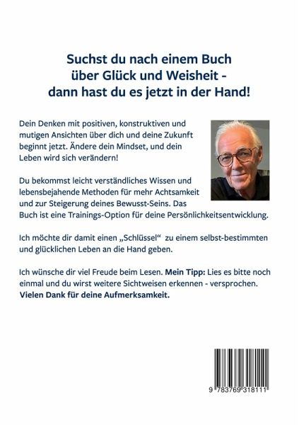 Suchst du nach einem Buch zu Glück und Weisheit - dann hast du es jetzt in der Hand! Dein Denken mit positiven, konstruktiven und mutigen Ansichten über dich und deine Zukunft beginnt jetzt. Ändere dein Mindset, und dein Leben wird sich verändern! Du bekommst leicht verständliches Wissen und lebensbejahende Methoden für mehr Achtsamkeit und zur Steigerung deines Bewusst-Seins. Das Buch ist eine Trainings-Option für deine Persönlichkeitsentwicklung. Ich möchte dir damit einen Schlüssel zu einem selbst-bestimmten und glücklichen Leben an die Hand geben. Ich wünsche dir viel Freude beim Lesen. Mein Tipp: Lies es bitte noch einmal und du wirst weitere Sichtweisen erkennen - versprochen. Vielen Dank für deine Aufmerksamkeit.