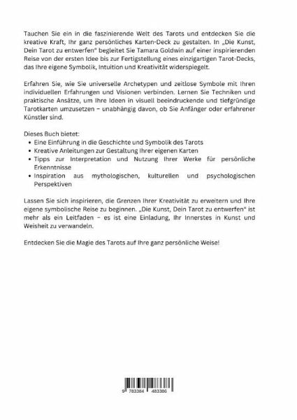 Tauchen Sie ein in die faszinierende Welt des Tarots und entdecken Sie die kreative Kraft, Ihr ganz persönliches Karten-Deck zu gestalten. In "Die Kunst, Dein Tarot zu entwerfen" begleitet Sie Tamara Goldwin auf einer inspirierenden Reise von der ersten Idee bis zur Fertigstellung eines einzigartigen Tarot-Decks, das Ihre eigene Symbolik, Intuition und Kreativität widerspiegelt.Erfahren Sie, wie Sie universelle Archetypen und zeitlose Symbole mit Ihren individuellen Erfahrungen und Visionen verbinden. Lernen Sie Techniken und praktische Ansätze, um Ihre Ideen in visuell beeindruckende und tiefgründige Tarotkarten umzusetzen - unabhängig davon, ob Sie Anfänger oder erfahrener Künstler sind.Dieses Buch bietet:Eine Einführung in die Geschichte und Symbolik des TarotsKreative Anleitungen zur Gestaltung Ihrer eigenen KartenTipps zur Interpretation und Nutzung Ihrer Werke für persönliche ErkenntnisseInspiration aus mythologischen, kulturellen und psychologischen PerspektivenLassen Sie sich inspirieren, die Grenzen Ihrer Kreativität zu erweitern und Ihre eigene symbolische Reise zu beginnen. "Die Kunst, Dein Tarot zu entwerfen" ist mehr als ein Leitfaden - es ist eine Einladung, Ihr Innerstes in Kunst und Weisheit zu verwandeln.Entdecken Sie die Magie des Tarots auf Ihre ganz persönliche Weise!