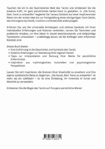 Tauchen Sie ein in die faszinierende Welt des Tarots und entdecken Sie die kreative Kraft, Ihr ganz persönliches Karten-Deck zu gestalten. In "Die Kunst, Dein Tarot zu entwerfen" begleitet Sie Tamara Goldwin auf einer inspirierenden Reise von der ersten Idee bis zur Fertigstellung eines einzigartigen Tarot-Decks, das Ihre eigene Symbolik, Intuition und Kreativität widerspiegelt.Erfahren Sie, wie Sie universelle Archetypen und zeitlose Symbole mit Ihren individuellen Erfahrungen und Visionen verbinden. Lernen Sie Techniken und praktische Ansätze, um Ihre Ideen in visuell beeindruckende und tiefgründige Tarotkarten umzusetzen - unabhängig davon, ob Sie Anfänger oder erfahrener Künstler sind.Dieses Buch bietet:Eine Einführung in die Geschichte und Symbolik des TarotsKreative Anleitungen zur Gestaltung Ihrer eigenen KartenTipps zur Interpretation und Nutzung Ihrer Werke für persönliche ErkenntnisseInspiration aus mythologischen, kulturellen und psychologischen PerspektivenLassen Sie sich inspirieren, die Grenzen Ihrer Kreativität zu erweitern und Ihre eigene symbolische Reise zu beginnen. "Die Kunst, Dein Tarot zu entwerfen" ist mehr als ein Leitfaden - es ist eine Einladung, Ihr Innerstes in Kunst und Weisheit zu verwandeln.Entdecken Sie die Magie des Tarots auf Ihre ganz persönliche Weise!
