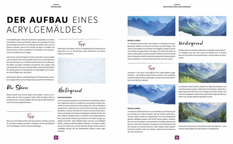 Im praktischen Grundlagenteil vermittelt die Autorin ihr Wissen zu Farbtheorie, Perspektive, Schattierungen, Farbauftrag, Materialien und den grundlegenden Techniken der Acrylmalerei. Mit diesen Basics ausgestattet kann es nun an die vielen Motive gehen. Schritt für Schritt werden unterschiedlichste Landschaften gezaubert. Eine blühende Alpenwiese, tropische Strände, Wasserfälle und Bergpanoramen stellen nur einen kleinen Teil dieser Vielfalt dar. Naturrealistische Tier-Motive ergänzen die Landschaften und der Ausflug in die Welt der Fantasy-Malerei regt die Fantasie in besonderer Weise an. Mit den hilfreichen Tipps und Videomaterialvom Profi werden sowohl Anfänger als auch Fortgeschrittene sicher zum Erfolg geführt.