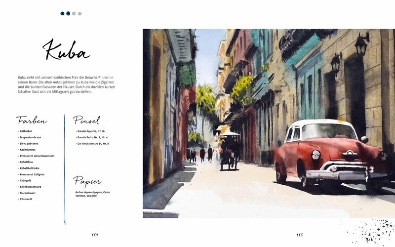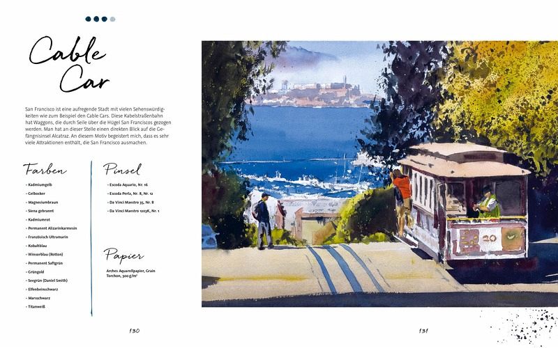 Alle Grundlagen zu Material, Farbenlehre und MaltechnikenMit zahlreichen Übungen im Grundlagenteil, um die Theorie direkt praktisch umzusetzen20 Städtemotive mit Step by Step-AnleitungZahlreiche Tipps vom Profi