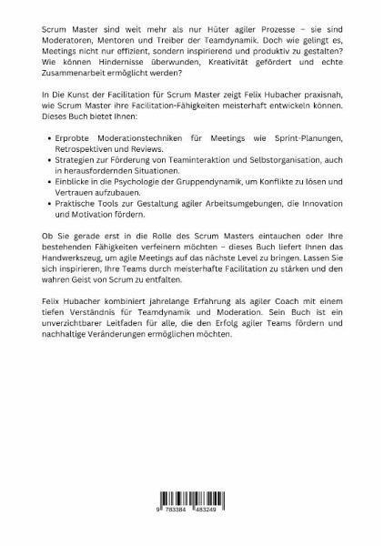 Scrum Master sind weit mehr als nur Hüter agiler Prozesse - sie sind Moderatoren, Mentoren und Treiber der Teamdynamik. Doch wie gelingt es, Meetings nicht nur effizient, sondern inspirierend und produktiv zu gestalten? Wie können Hindernisse überwunden, Kreativität gefördert und echte Zusammenarbeit ermöglicht werden?In Die Kunst der Facilitation für Scrum Master zeigt Felix Hubacher praxisnah, wie Scrum Master ihre Facilitation-Fähigkeiten meisterhaft entwickeln können. Dieses Buch bietet Ihnen:Erprobte Moderationstechniken für Meetings wie Sprint-Planungen, Retrospektiven und Reviews.Strategien zur Förderung von Teaminteraktion und Selbstorganisation, auch in heraus-fordernden Situationen.Einblicke in die Psychologie der Gruppendynamik, um Konflikte zu lösen und Vertrauen aufzubauen.Praktische Tools zur Gestaltung agiler Arbeitsumgebungen, die Innovation und Motivation fördern.Ob Sie gerade erst in die Rolle des Scrum Masters eintauchen oder Ihre bestehenden Fähigkeiten verfeinern möchten - dieses Buch liefert Ihnen das Handwerkszeug, um agile Meetings auf das nächste Level zu bringen. Lassen Sie sich inspirieren, Ihre Teams durch meisterhafte Facilitation zu stärken und den wahren Geist von Scrum zu entfalten.Felix Hubacher kombiniert jahrelange Erfahrung als agiler Coach mit einem tiefen Verständnis für Teamdynamik und Moderation. Sein Buch ist ein unverzichtbarer Leitfaden für alle, die den Erfolg agiler Teams fördern und nachhaltige Veränderungen ermöglichen möchten.
