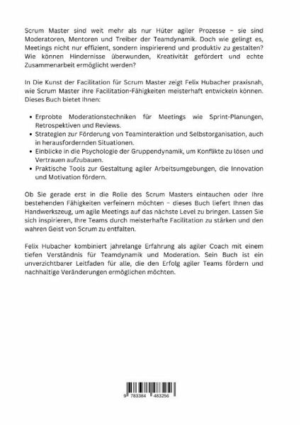 Scrum Master sind weit mehr als nur Hüter agiler Prozesse - sie sind Moderatoren, Mentoren und Treiber der Teamdynamik. Doch wie gelingt es, Meetings nicht nur effizient, sondern inspirierend und produktiv zu gestalten? Wie können Hindernisse überwunden, Kreativität gefördert und echte Zusammenarbeit ermöglicht werden?In Die Kunst der Facilitation für Scrum Master zeigt Felix Hubacher praxisnah, wie Scrum Master ihre Facilitation-Fähigkeiten meisterhaft entwickeln können. Dieses Buch bietet Ihnen:Erprobte Moderationstechniken für Meetings wie Sprint-Planungen, Retrospektiven und Reviews.Strategien zur Förderung von Teaminteraktion und Selbstorganisation, auch in heraus-fordernden Situationen.Einblicke in die Psychologie der Gruppendynamik, um Konflikte zu lösen und Vertrauen aufzubauen.Praktische Tools zur Gestaltung agiler Arbeitsumgebungen, die Innovation und Motivation fördern.Ob Sie gerade erst in die Rolle des Scrum Masters eintauchen oder Ihre bestehenden Fähigkeiten verfeinern möchten - dieses Buch liefert Ihnen das Handwerkszeug, um agile Meetings auf das nächste Level zu bringen. Lassen Sie sich inspirieren, Ihre Teams durch meisterhafte Facilitation zu stärken und den wahren Geist von Scrum zu entfalten.Felix Hubacher kombiniert jahrelange Erfahrung als agiler Coach mit einem tiefen Verständnis für Teamdynamik und Moderation. Sein Buch ist ein unverzichtbarer Leitfaden für alle, die den Erfolg agiler Teams fördern und nachhaltige Veränderungen ermöglichen möchten.