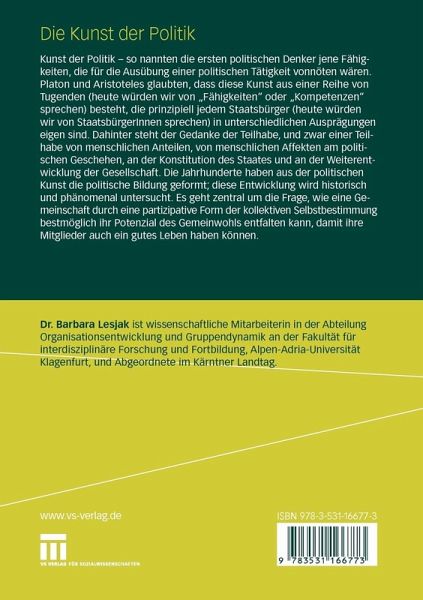Kunst der Politik - so nannten die ersten politischen Denker jene Fähigkeiten, die für die Ausübung einer politischen Tätigkeit vonnöten wären. Platon und Aristoteles glaubten, dass diese Kunst aus einer Reihe von Tugenden (heute würden wir von "Fähigkeiten" oder "Kompetenzen" sprechen) besteht, die prinzipiell jedem Staatsbürger (heute würden wir von StaatsbürgerInnen sprechen) in unterschiedlichen Ausprägungen eigen sind. Dahinter steht der Gedanke der Teilhabe, und zwar einer Teilhabe von menschlichen Anteilen, von menschlichen Affekten am politischen Geschehen, an der Konstitution des Staates und an der Weiterentwicklung der Gesellschaft.
