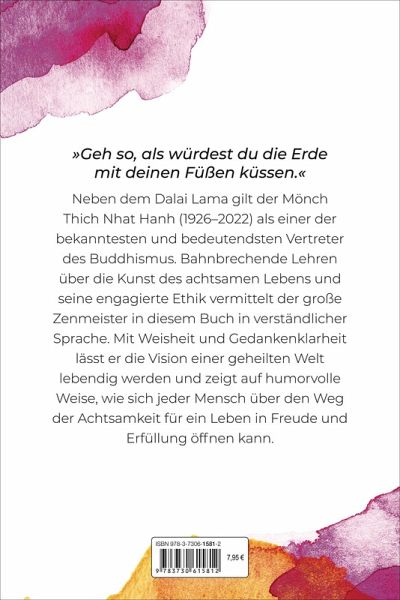 Einer der ersten Bestseller Thich Nhat Hanhs»Lächle, atme ein und gehe langsam.« Thich Nhat Hanh»Manchmal ist Ihre Freude die Quelle Ihres Lächelns, aber manchmal kann Ihr Lächeln die Quelle Ihrer Freude sein.« Thich Nhat Hanh»Achtsamkeit kann uns dabei helfen, wieder zu kommunizieren, vor allem mit uns selbst.« Thich Nhat Hanh»Geh so, als würdest du die Erde mit deinen Füßen küssen.« Thich Nath Hanh