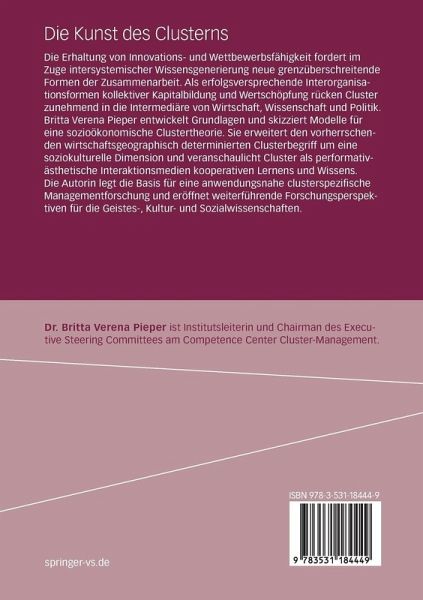 Die Erhaltung von Innovations- und Wettbewerbsfähigkeit fordert im Zuge intersystemischer Wissensgenerierung neue grenzüberschreitende Formen der Zusammenarbeit. Als erfolgsversprechende Interorganisationsformen kollektiver Kapitalbildung und Wertschöpfung rücken Cluster zunehmend in die Intermediäre von Wirtschaft, Wissenschaft und Politik. Britta Verena Pieper entwickelt Grundlagen und skizziert Modelle für eine sozioökonomische Clustertheorie. Sie erweitert den vorherrschenden wirtschaftsgeographisch determinierten Clusterbegriff um eine soziokulturelle Dimension und veranschaulicht Cluster als performativästhetische Interaktionsmedien kooperativen Lernens und Wissens. Die Autorin legt die Basis für eine anwendungsnahe clusterspezifische Managementforschung und eröffnet weiterführende Forschungsperspektiven für die Geistes-, Kultur- und Sozialwissenschaften.