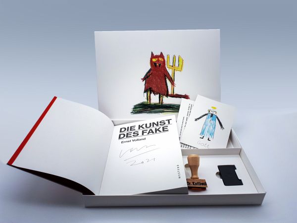 Limitierte AusgabeJetzt gibt es Die Kunst des Fake als besonderes Geschenkbuch in einer limitierten Sonderausgabe mit einem signierten Buch, der Kunstaktion "Dr. Kattbeck - to cut out and to send back", mit der Sie zum Beispiel dämliche Fakes in Zeitschriften markieren und zurückschicken können, und mit je einer Postkarte von Gott und dem Teufel.Alle reden von Fakes - Ernst Volland hat sie zur aufklärerischen Kunstform entwickelt. Er schlich sich in die Post von Kardinälen und Bischöfen, fragte nach Gott und Teufel, foppte amerikanische Botschafter und schonte weder die politische "Elite" in Deutschland noch die Edelfedern der Presse. Ein hintergründiger Humor, der erhellenden Spaß macht.Limitierte und signierte Sonderausgabe (Stückzahl 150)- signiertes Buch- zwei Postkarten- Die Kunstaktion Dr. KattbeckWerden Sie Teil einer Kunstaktion von Dr. Kattbeck dem Alter Ego von Ernst Volland. "Dr. Kattbeck - to cut out and to send back. Mit dieser Aktion wehren Sie sich gegen dumme Artikel in Ihrer Zeitung. Wie? Ganz einfach. Sie schneiden den dummen Artikel aus der Zeitung, stempeln Dr. Kattbeck an den Rand und schicken diesen dem Autor mit der Post zurück. Kunst! Dr. Kattbeck Merci"Ernst Volland liefert alles, was Sie brauchen. Nur die Artikel müssen Sie selber finden. Über die Schulter schauen Ihnen dabei (in Form von Postkarten) Gott auf der einen Seite und der Teufel auf der anderen Seite.