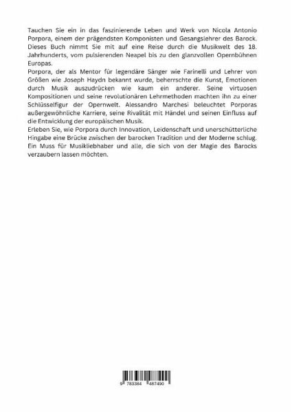 Tauchen Sie ein in das faszinierende Leben und Werk von Nicola Antonio Porpora, einem der prägendsten Komponisten und Gesangslehrer des Barock. Dieses Buch nimmt Sie mit auf eine Reise durch die Musikwelt des 18. Jahrhunderts, vom pulsierenden Neapel bis zu den glanzvollen Opernbühnen Europas.Porpora, der als Mentor für legendäre Sänger wie Farinelli und Lehrer von Größen wie Joseph Haydn bekannt wurde, beherrschte die Kunst, Emotionen durch Musik auszudrücken wie kaum ein anderer. Seine virtuosen Kompositionen und seine revolutionären Lehrmethoden machten ihn zu einer Schlüsselfigur der Opernwelt. Alessandro Marchesi beleuchtet Porporas außergewöhnliche Karriere, seine Rivalität mit Händel und seinen Einfluss auf die Entwicklung der europäischen Musik.Erleben Sie, wie Porpora durch Innovation, Leidenschaft und unerschütterliche Hingabe eine Brücke zwischen der barocken Tradition und der Moderne schlug. Ein Muss für Musikliebhaber und alle, die sich von der Magie des Barocks verzaubern lassen möchten.