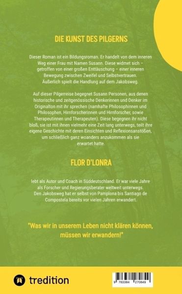 Dieser Roman ist ein Bildungsroman. Er handelt von dem inneren Weg einer Frau mit Namen Susann. Diese widmet sich - getroffen von einer großen Enttäuschung - einer inneren Bewegung zwischen Zweifel und Selbstvertrauen zu. Äußerlich ist die Handlung auf dem Jakobsweg inszeniert. Auf dieser Pilgerreise begegnen Susann Personen, aus denen historische Denker und Denkerinnen im Originalton mit ihr sprechen (namhafte Philosophen, Hirnforscher und Therapeuten). Diese begegnen ihr nicht bloß, sie ist mit ihnen vielmehr eine Zeit lang unterwegs, teilt ihre eigene Geschichte mit deren Einsichten und Reflexionsanstößen, um schließlich ganz woanders anzukommen als sie erwartet hatte.Susann erkennt auf ihrem langen Weg, dass es bloß einen Weg gibt, um sich aus schwierigen oder gar aussichtslos erscheinenden Lagen zu befreien: die Selbstveränderung. In einem mühsamen und steinigen Prozess der Klärung, erarbeitet sie sich neue Zugänge zu sich selbst und dem Menschen, den sie liebt. Damit öffnensich neue Türen für die gemeinsame Perspektive ihrer Beziehung.