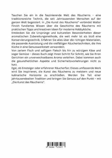 Tauchen Sie ein in die faszinierende Welt des Räucherns - eine traditionsreiche Technik, die seit Jahrtausenden Menschen auf der ganzen Welt begeistert. In "Die Kunst des Räucherns" verbindet Walter Finckh fundiertes Wissen über die Geschichte des Räucherns mit praktischen Tipps und kreativen Ideen für moderne Hobbyköche.Entdecken Sie die Ursprünge und kulturellen Besonderheiten dieser aromatischen Zubereitungsmethode, die weit mehr ist als bloß eine Konservierungstechnik. Erfahren Sie alles über die richtigen Materialien, die passende Ausrüstung und die vielfältigen Räuchertechniken, die Ihre Küche in eine Genusswerkstatt verwandeln.Von zartem Fisch und saftigem Fleisch bis hin zu würzigem Käse und sogar Gemüse - dieses Buch zeigt Ihnen Schritt für Schritt, wie Sie Ihren Gerichten ein unverwechselbares Aroma verleihen. Dabei kommen auch die gesundheitlichen Aspekte und Sicherheitsvorkehrungen nicht zu kurz.Egal, ob Einsteiger oder erfahrener Räucherfan: Dieses umfassende Werk wird Sie inspirieren, die Kunst des Räucherns zu meistern und neue kulinarische Horizonte zu erschließen. Werden Sie Teil einer jahrtausendealten Tradition und bringen Sie Genuss auf den Punkt - mit "Die Kunst des Räucherns".Walter Finckh ist ein erfahrener Autor und leidenschaftlicher Hobbykoch, der sein umfangreiches Wissen über die Techniken und Geschichte des Räucherns mit einer Prise Kreativität und Leichtigkeit vermittelt.