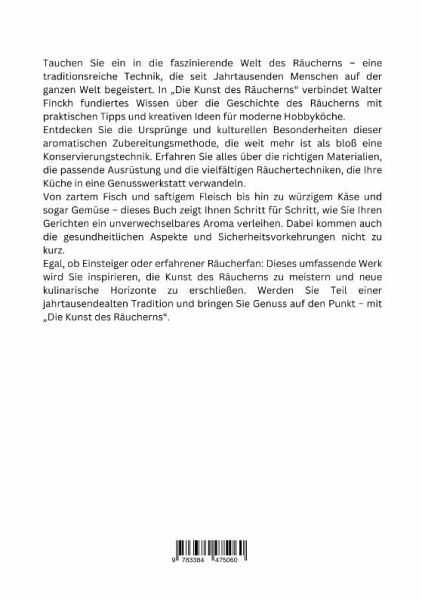 Tauchen Sie ein in die faszinierende Welt des Räucherns - eine traditionsreiche Technik, die seit Jahrtausenden Menschen auf der ganzen Welt begeistert. In "Die Kunst des Räucherns" verbindet Walter Finckh fundiertes Wissen über die Geschichte des Räucherns mit praktischen Tipps und kreativen Ideen für moderne Hobbyköche.Entdecken Sie die Ursprünge und kulturellen Besonderheiten dieser aromatischen Zubereitungsmethode, die weit mehr ist als bloß eine Konservierungstechnik. Erfahren Sie alles über die richtigen Materialien, die passende Ausrüstung und die vielfältigen Räuchertechniken, die Ihre Küche in eine Genusswerkstatt verwandeln.Von zartem Fisch und saftigem Fleisch bis hin zu würzigem Käse und sogar Gemüse - dieses Buch zeigt Ihnen Schritt für Schritt, wie Sie Ihren Gerichten ein unverwechselbares Aroma verleihen. Dabei kommen auch die gesundheitlichen Aspekte und Sicherheitsvorkehrungen nicht zu kurz.Egal, ob Einsteiger oder erfahrener Räucherfan: Dieses umfassende Werk wird Sie inspirieren, die Kunst des Räucherns zu meistern und neue kulinarische Horizonte zu erschließen. Werden Sie Teil einer jahrtausendealten Tradition und bringen Sie Genuss auf den Punkt - mit "Die Kunst des Räucherns".Walter Finckh ist ein erfahrener Autor und leidenschaftlicher Hobbykoch, der sein umfangreiches Wissen über die Techniken und Geschichte des Räucherns mit einer Prise Kreativität und Leichtigkeit vermittelt.