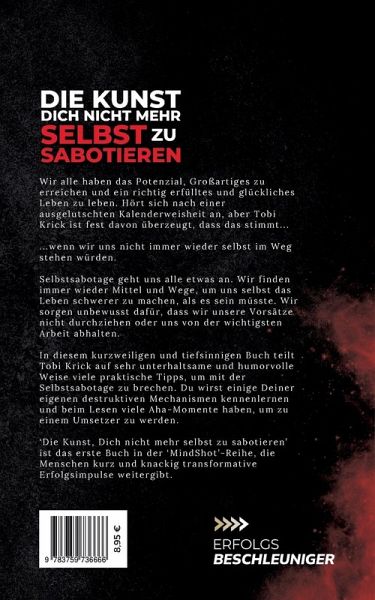 Wir alle haben das Potenzial, Großartiges zu leisten und ein wirklich erfülltes und glückliches Leben zu führen. Klingt wie eine abgedroschene Kalenderweisheit, aber Tobi Krick ist fest davon überzeugt......wenn wir uns nicht immer wieder selbst im Weg stünden.Selbstsabotage geht uns alle an. Wir finden immer wieder Wege, uns das Leben schwerer zu machen, als es sein müsste. Wir sorgen unbewusst dafür, dass wir unsere Vorsätze nicht in die Tat umsetzen oder uns von wichtigen Dingen abhalten.In diesem unterhaltsamen und tiefgründigen Buch gibt Tobi Krick auf sehr unterhaltsame und humorvolle Weise viele praktische Tipps, um die Selbstsabotage zu durchbrechen. Du lernst einige Deiner eigenen destruktiven Mechanismen kennen und wirst beim Lesen viele Aha-Erlebnisse haben, um zum Umsetzer zu werden.Die Kunst, sich nicht mehr selbst zu sabotieren' ist das erste Buch der 'MindShot'-Reihe, die Menschen kurz und prägnant transformative Erfolgsimpulse vermittelt.
