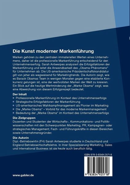 Marken gehören zu den zentralen immateriellen Werten eines Unternehmens, daher ist die professionelle Markenführung entscheidend für den Unternehmenserfolg. Sarah Antwerpes analysiert die Erfolgsfaktoren der Markenführung und leitet die Anwendbarkeit des "Obama-Phänomens" für Unternehmen ab: Die US-amerikanische Präsidentschaftskandidatur gilt von jeher als wegweisend für Marketingtrends. Die Autorin zeigt, wie es Barack Obamas Team in wenigen Monaten gegen eine etablierte Konkurrenz gelungen ist, eine der wertvollsten Marken der Welt zu kreieren. Ein Blick auf die heutige Wertminderung der "Marke Obama" zeigt, was eine Abweichung von diesem Erfolgsrezept bedeutet.
