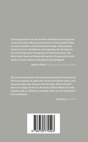 Jeder, der dieses Buch gelesen hat, sollte danach die Regeln des Kunstmarktes genauso gut kennen wie ein Fußballer die Regeln des Fußballspiels. Hier geht es darum eine kritische Analyse der Spielregeln des Kunstmarktes zu liefern, sowie empirisch zu beschreiben, wie diese in ausgewählten Teilmärkten angewendet werden.Die Frage "Was ist Kunst?" steht zwar nicht im Zentrum dieser Untersuchung, in der es primär um die Frage geht "Wie funktioniert der Kunstmarkt?" Doch der Autor hält das weit verbreitete Dogma, wonach Kunst nicht definierbar sei, für einen der Hauptgründe der Intransparenz des Kunstmarktes. Deshalb versucht er im letzten Kapitel dieses Buches die Frage "Was ist Kunst?" zu beantworten. Und zwar definitiv!