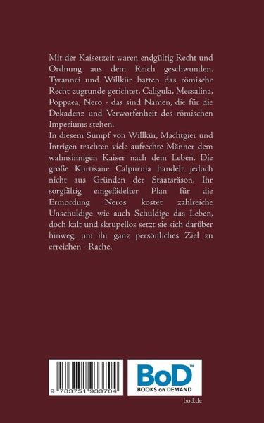Mit der Kaiserzeit waren endgültig Recht und Ordnung aus dem Reich geschwunden. Tyrannei und Willkür hatten das römische Recht zugrunde gerichtet. Caligula, Messalina, Poppaea, Nero - das sind Namen, die für die Dekadenz und Verworfenheit des römischen Imperiums stehen.In diesem Sumpf von Willkür, Machtgier und Intrigen trachten viele aufrechte Männer dem wahnsinnigen Kaiser nach dem Leben. Die große Kurtisane Calpurnia handelt jedoch nicht aus Gründen der Staatsräson. Ihr sorgfältig eingefädelter Plan für die Ermordung Neros kostet zahlreiche Unschuldige wie auch Schuldige das Leben, doch kalt und skrupellos setzt sie sich darüber hinweg, um ihr ganz persönliches Ziel zu erreichen - Rache.