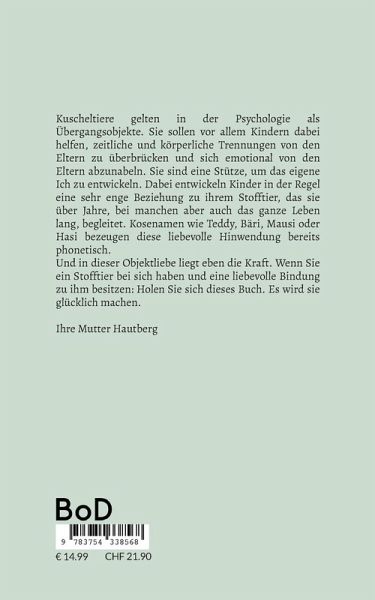 Kuscheltiere gelten in der Psychologie als Übergangsobjekte. Sie sollen vor allem Kindern dabei helfen, zeitliche und körperliche Trennungen von den Eltern zu überbrücken und sich emotional von den Eltern abzunabeln. Sie sind eine Stütze, um das eigene Ich zu entwickeln. Dabei entwickeln Kinder in der Regel eine sehr enge Beziehung zu ihrem Stofftier, das sie über Jahre, bei manchen aber auch das ganze Leben lang, begleitet. Kosenamen wie Teddy, Bäri, Mausi oder Hasi bezeugen diese liebevolle Hinwendung bereits phonetisch.Und in dieser Objektliebe liegt eben die Kraft. Wenn Sie ein Stofftier bei sich haben und eine liebevolle Bindung zu ihm besitzen: Holen Sie sich dieses Buch. Es wird sie glücklich machen. Ihre Mutter Hautberg