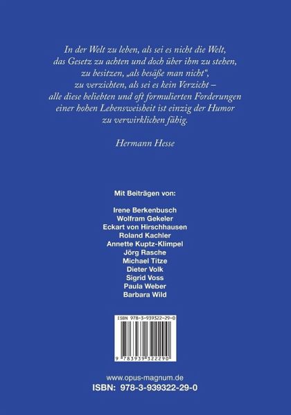 In der Welt zu leben, als sei es nicht die Welt, das Gesetz zu achten und doch über ihm zu stehen, zu besitzen, ¿als besäße man nicht¿, zu verzichten, als sei es kein Verzicht ¿ alle diese beliebten und oft formulierten Forderungen einer hohen Lebensweisheit ist einzig der Humor zu verwirklichen fähig. Hermann Hesse