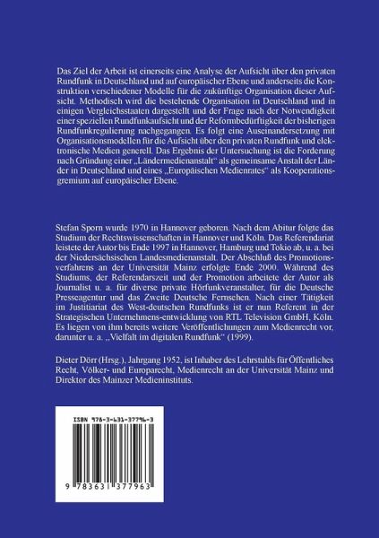 Das Ziel der Arbeit ist einerseits eine Analyse der Aufsicht über den privaten Rundfunk in Deutschland und auf europäischer Ebene und anderseits die Konstruktion verschiedener Modelle für die zukünftige Organisation dieser Aufsicht. Methodisch wird die bestehende Organisation in Deutschland und in einigen Vergleichsstaaten dargestellt und der Frage nach der Notwendigkeit einer speziellen Rundfunkaufsicht und der Reformbedürftigkeit der bisherigen Rundfunkregulierung nachgegangen. Es folgt eine Auseinandersetzung mit Organisationsmodellen für die Aufsicht über den privaten Rundfunk und elektronische Medien generell. Das Ergebnis der Untersuchung ist die Forderung nach Gründung einer "Ländermedienanstalt" als gemeinsame Anstalt der Länder in Deutschland und eines "Europäischen Medienrates" als Kooperationsgremium auf europäischer Ebene.