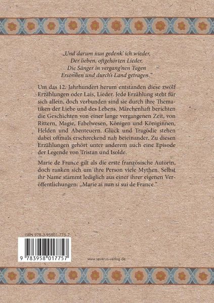 "Und darum nun gedenk' ich wieder,Der lieben, oftgehörten Lieder,Die Sänger in vergang'nen TagenErsonnen und durch's Land getragen."Um das 12. Jahrhundert herum entstanden diese zwölf Erzählungen oder Lais, Lieder. Jede Erzählung steht für sich allein, doch verbunden sind sie durch ihre Thematiken der Liebe und des Lebens. Märchenhaft berichten die Geschichten von einer lange vergangenen Zeit, von Rittern, Magie, Fabelwesen, Königen und Königinnen, Helden und Abenteuern. Glück und Tragödie stehen dabei oftmals erschreckend nah beieinander. Zu diesen Erzählungen gehört unter anderem auch eine Episode der Legende von Tristan und Isolde. Marie de France gilt als die erste französische Autorin, doch ranken sich um ihre Person viele Mythen. Selbst ihr Name stammt lediglich aus einer ihrer eigenen Veröffentlichungen: "Marie ai nun si sui de France."