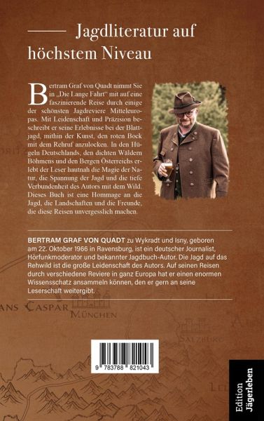 Jagdliteratur auf höchstem Niveau Bertram Graf von Quadt nimmt Sie in "Die Lange Fahrt" mit auf eine faszinierende Reise durch einige der schönsten Jagdreviere Mitteleuropas. Mit Leidenschaft und Präzision beschreibt er seine Erlebnisse bei der Blattjagd, mithin der Kunst, den roten Bock mit dem Rehruf anzulocken. In den Hügeln Deutschlands, den dichten Wäldern Böhmens und den Bergen Österreichs erlebt der Leser hautnah die Magie der Natur, die Spannung der Jagd und die tiefe Verbundenheit des Autors mit dem Wild. Dieses Buch ist eine Hommage an die Jagd, die Landschaften und die Freunde, die diese Reisen unvergesslich machen.