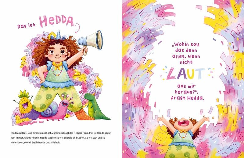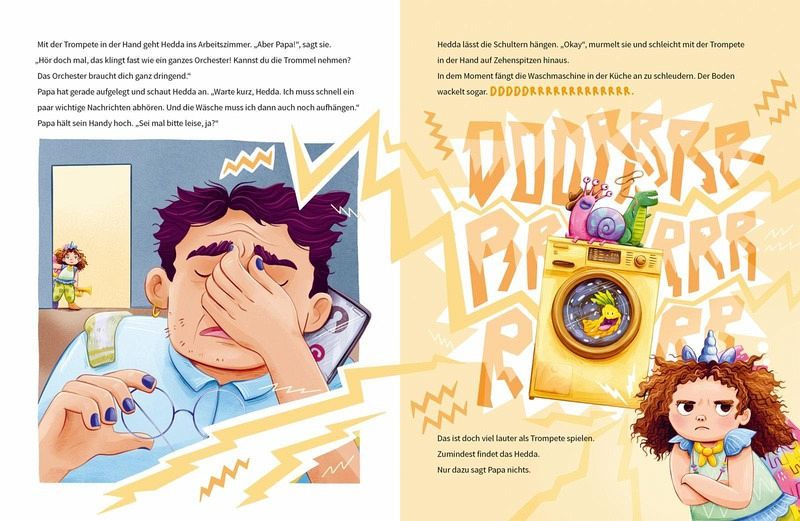 Hedda findet es richtig blöd, dass Papa sie immerzu um Ruhe bittet, und sie wird davon sehr wütend. Und extralaut. Die ganze Wut über die Ungerechtigkeit und Papas Beschäftigsein bricht sich Bahn. Hedda stampft und brüllt und weint viel lauter als die Waschmaschine, die Hunde oder das Motorrad.