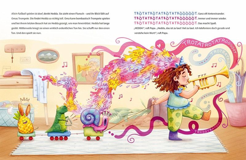 Hedda findet das sehr seltsam, denn über die bellenden Nachbarshunde, das knatternde Motorrad vor dem Fenster oder die wummernde Waschmaschine in der Küche beschwert Papa sich nie. Dabei machen die wirklich Krach. Sie hingegen spielt doch nur! Fußball im Flur, zum Beispiel. Klar, dass das auch mal wummst. Auch klar, dass sie beim Erschreckenspielen ganz laut "Buh" rufen muss, dass sie in Omas Trompete nicht leise pusten kann und dass Skitty, ihr Besenstiel-Wildpferd, nun mal mit dem Hufen klappert.