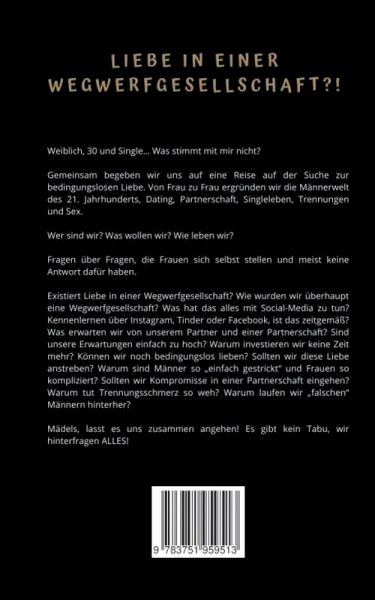 LIEBE IN EINER WEGWERFGESELLSCHAFT?!Weiblich, 30 und Single... Was stimmt mit mir nicht? Gemeinsam begeben wir uns auf eine Reise auf der Suche zur bedingungslosen Liebe. Von Frau zu Frau ergründen wir die Männerwelt des 21. Jahrhunderts, Dating, Partnerschaft, Singleleben, Trennungen und Sex.Wer sind wir? Was wollen wir? Wie leben wir?Fragen über Fragen, die Frauen sich selbst stellen und meist keine Antwort dafür haben.Existiert Liebe in einer Wegwerfgesellschaft? Wie wurden wir überhaupt eine Wegwerfgesellschaft? Was hat das alles mit Social-Media zu tun? Kennenlernen über Instagram, Tinder oder Facebook, ist das zeitgemäß? Was erwarten wir von unserem Partner und einer Partnerschaft? Sind unsere Erwartungen einfach zu hoch? Warum investieren wir keine Zeit mehr? Können wir noch bedingungslos lieben? Sollten wir diese Liebe anstreben? Warum sind Männer so einfach gestrickt und Frauen so kompliziert? Sollten wir Kompromisse in einer Partnerschaft eingehen? Warum tut Trennungsschmerz so weh? Warum laufen wir falschen Männern hinterher?Mädels, lasst es uns zusammen angehen! Es gibt kein Tabu, wir hinterfragen ALLES!